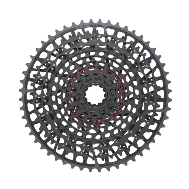 The XX Eagle Transmission (T-Type) Cassette is a major reason why Eagle Transmission offers the best-ever inboard and outboard shifting performance under load. Thanks to its full X-Sync design, the harder you pedal, the better it shifts. Literally. Engineered as integrated and interdependent transmission components, the XX Eagle Transmission Cassette and derailleur contact directly, ensuring perfect alignment on every bike. From its massive 520% gear range, the 52 tooth cog steps down with improved gear progression with 44 and 38 tooth cogs in the low end (compared to the Eagle drivetrain 10-52-tooth cassette). It lasts far longer and delivers more precision with the use of less extreme chain angles throughout the entire range. Featuring a clearly marked Setup Cog, install is both simple and fool-proof. Utilizes hardened tool steel machined X-Dome design for the cluster and stamped steel 38T and 44Tcogs are pinned to the lighter weight aluminum 12th gear. (Spider Cog)